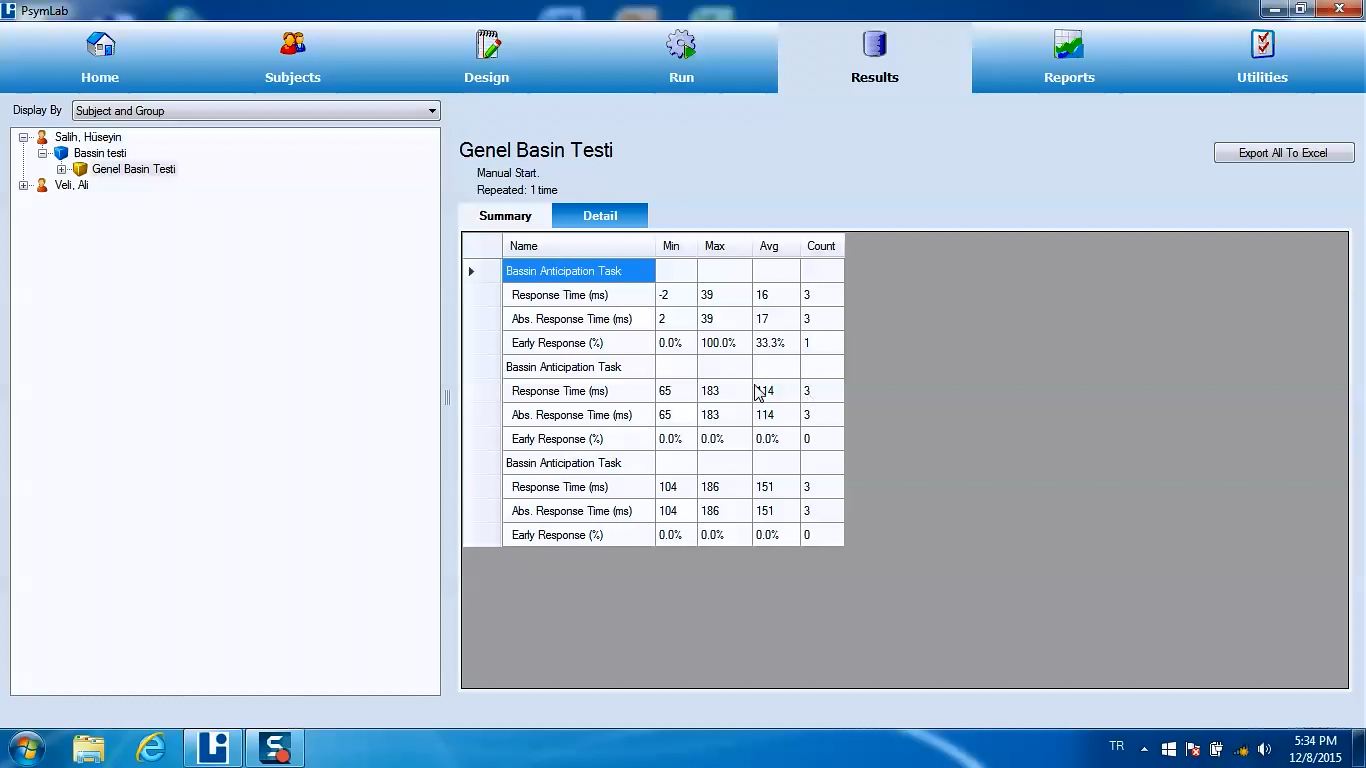 Psikomotor yazılımıyla, hazır protokolleri gerçek zamanlı olarak uygulatabilir, protokolleri kişiselleştirebilir ve sonuçları otomatik raporlar halinde alabilirsiniz. Tek bir tuşla tüm testleri EXCEL vb. istatiksel yazılımlara gönderebilirsiniz